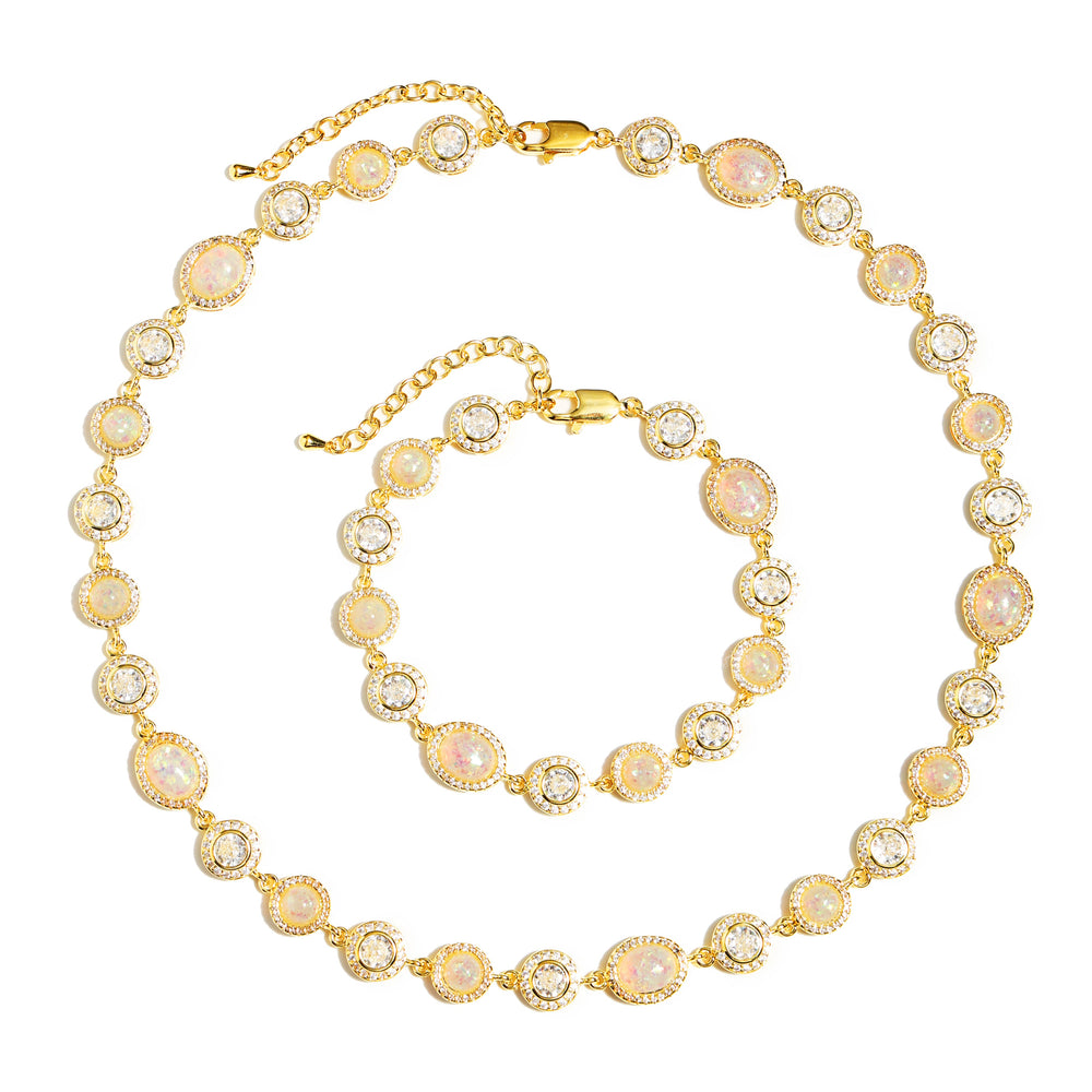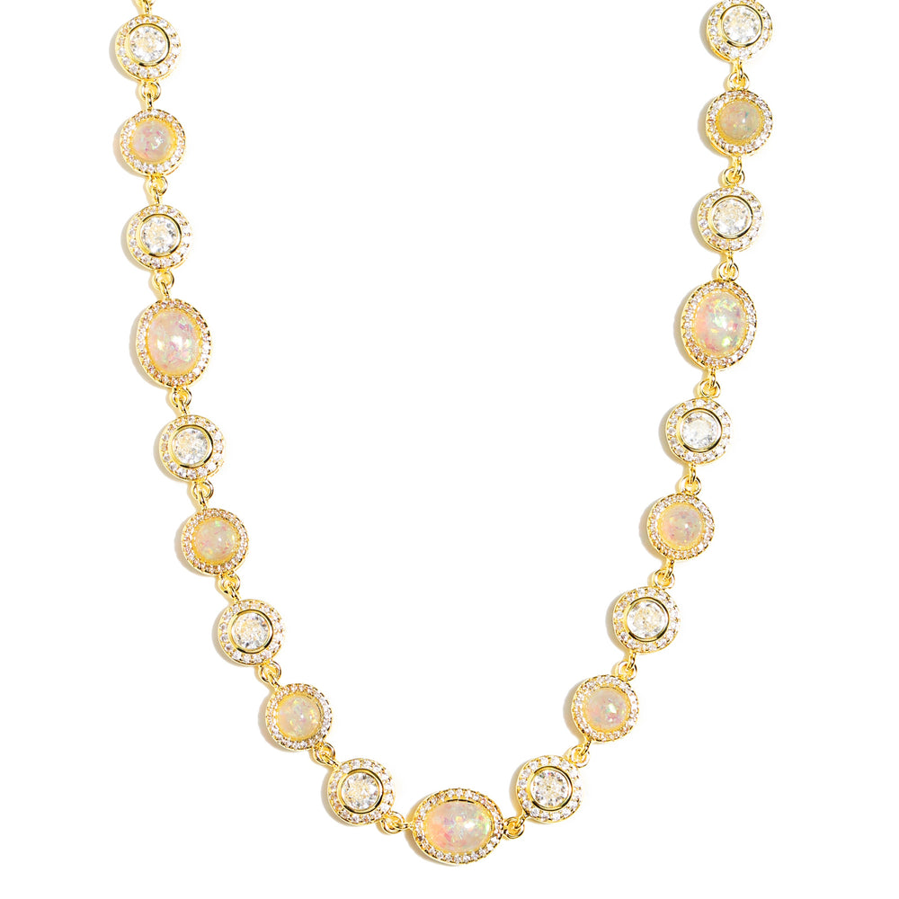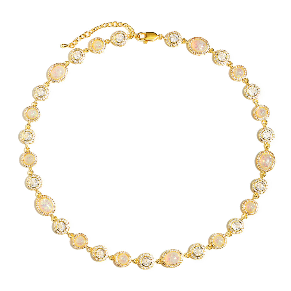 A selection of natural champagne and white Opal, alternating in delicate proportions. Each gem is like being kissed by the Milky Way, with the flow of light showing a dreamy iridescent effect. The precious stones are delicately wrapped with small white diamonds, such as stars around the moon🌙, weaving a gentle and bright halo around the neck.