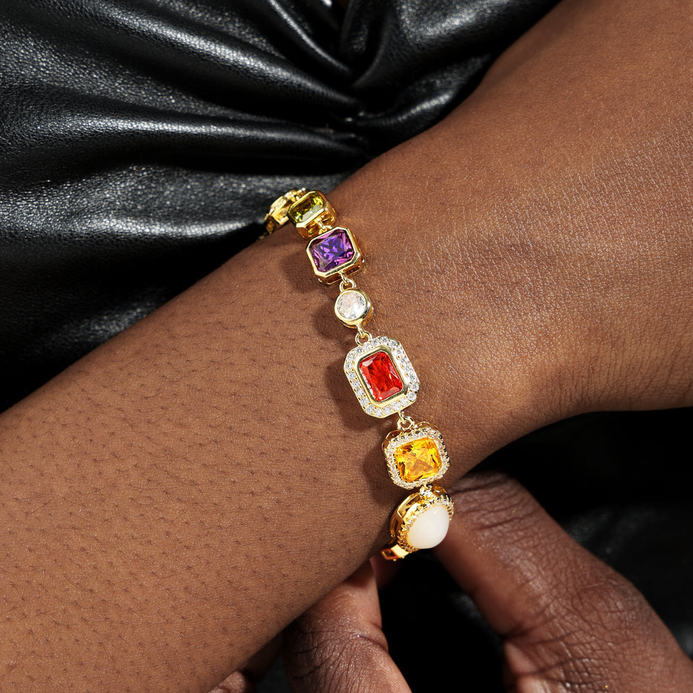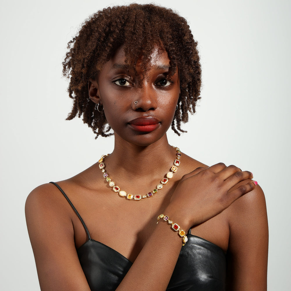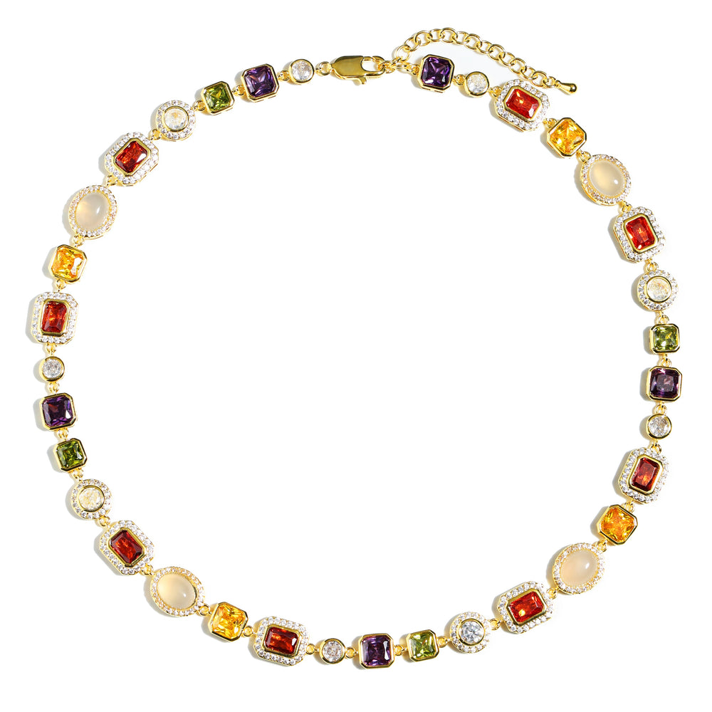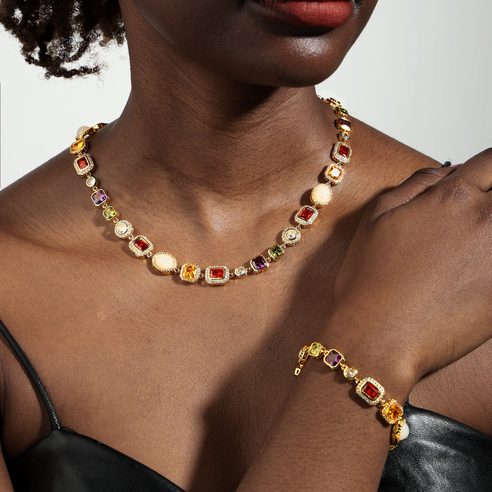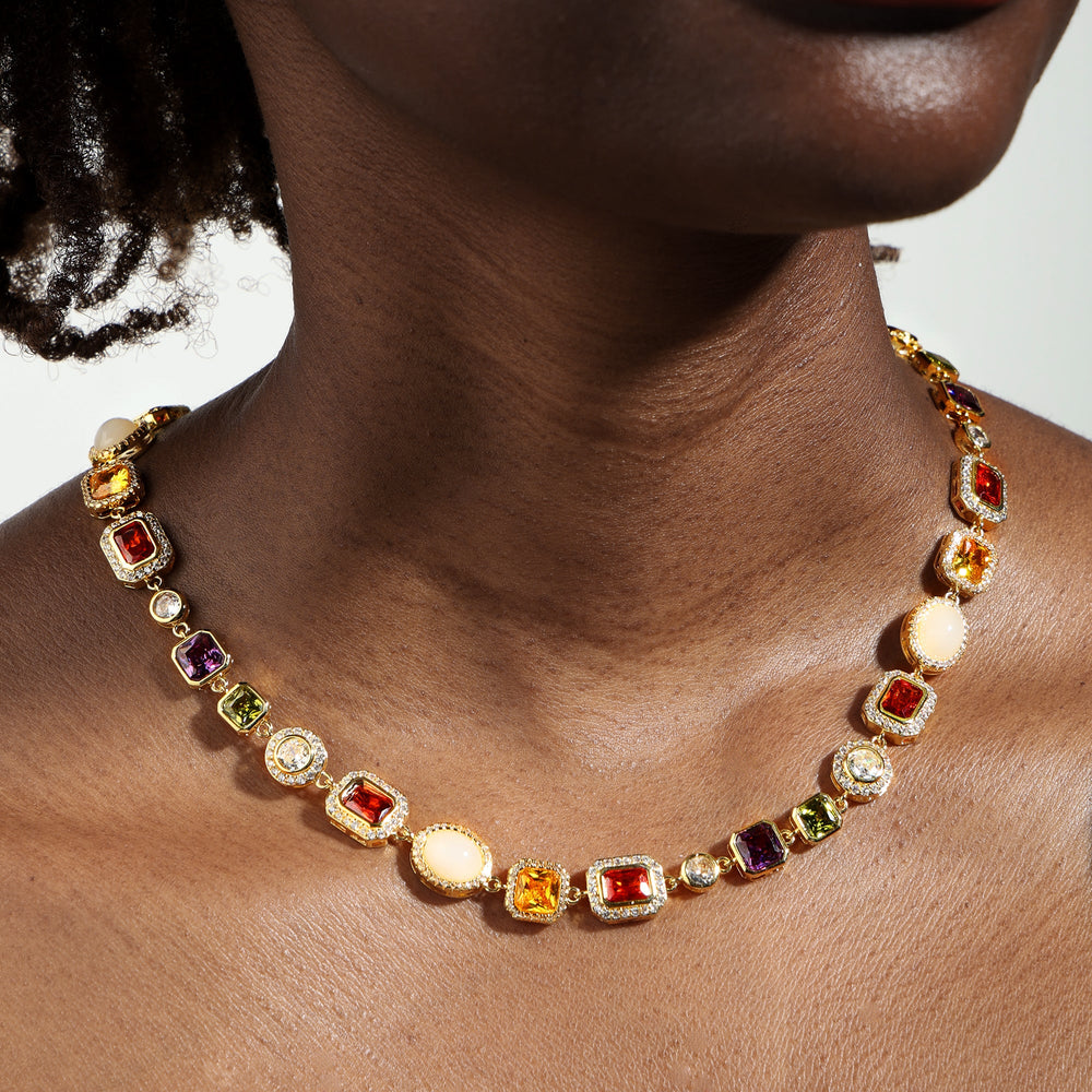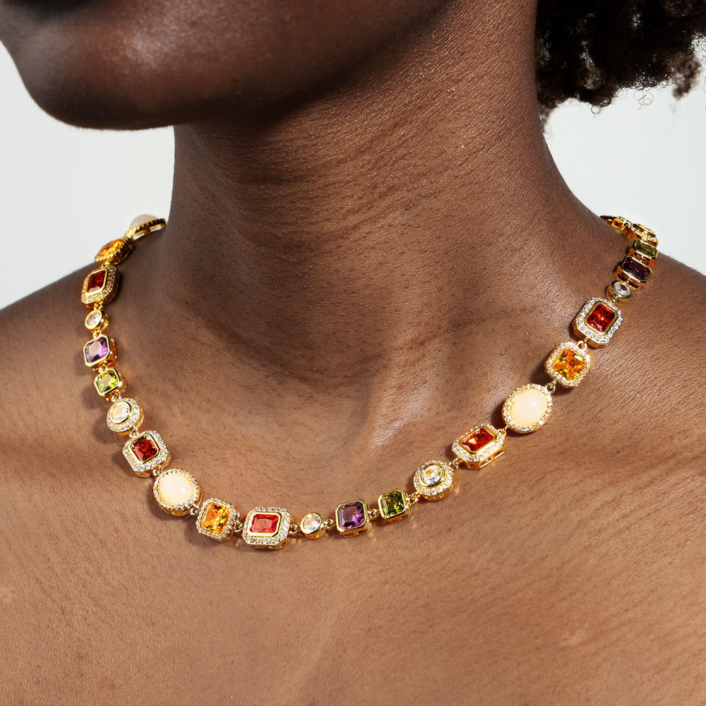 This Beautiful Gemstone💎💎 Necklace showcases hues of ruby, amethyst, amber. Each gem has been carefully selected and cleverly arranged to ensure that it maximizes its natural brilliance and charm.Larger, round cut opals balance the design.Unique coupled links ensure a seamless neckline fit, Great for individual wear and also a great statement piece for layering.