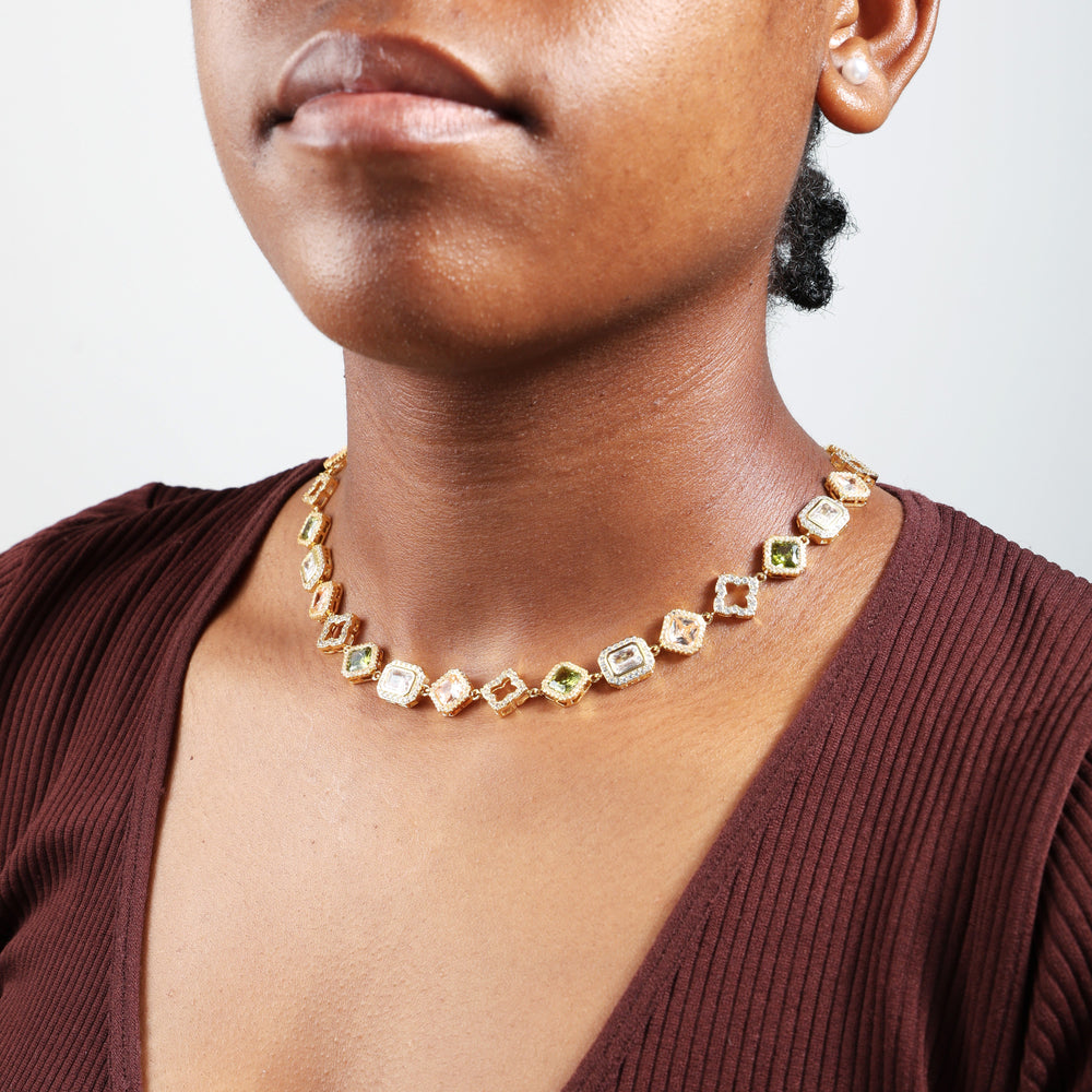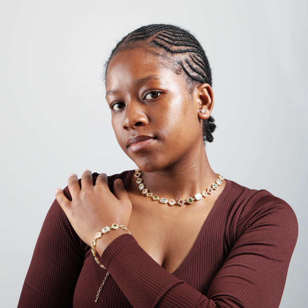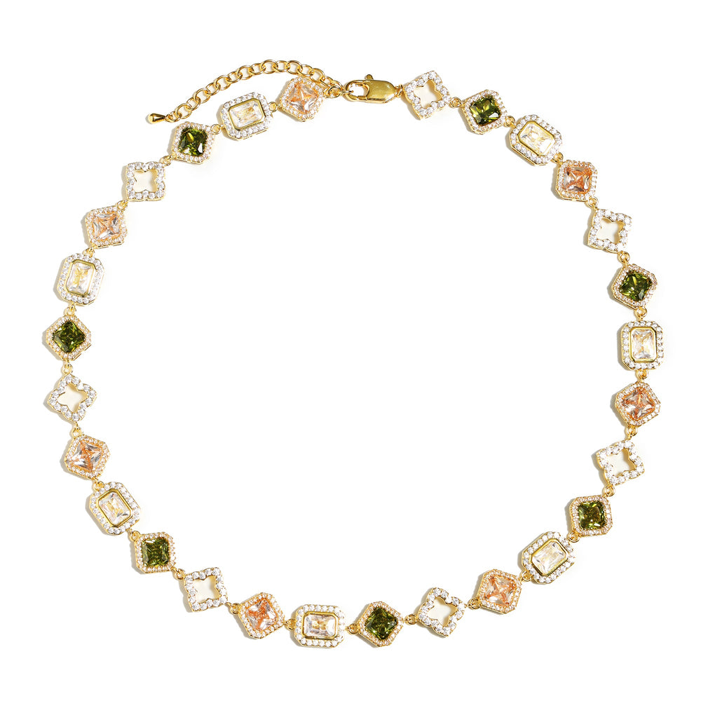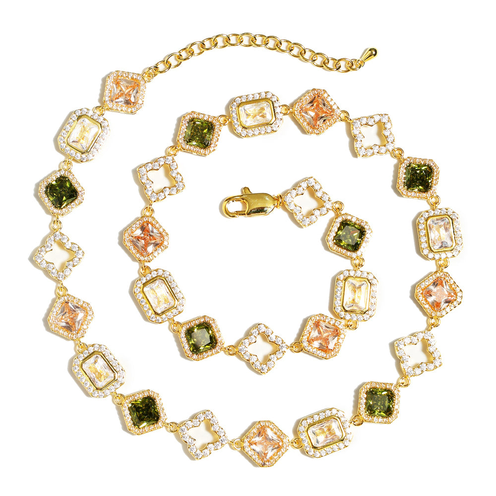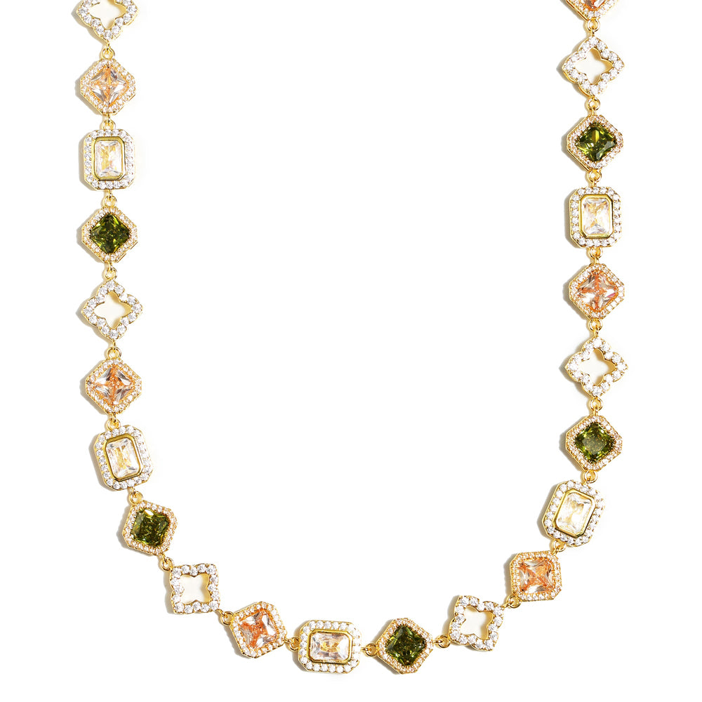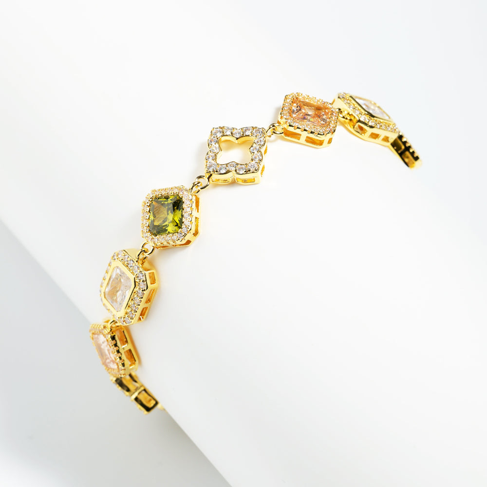 With fresh green, sunny yellow, gentle beige three colors of natural gems as the main stone, cut into square and rectangular modern geometric patterns, clean lines reveal modern aesthetics. The outer edge of each gem is inlaid with white broken diamond, glittering and shining like morning dew💧💧, more especially into the hollow four-leaf clover🍀🍀pattern, looming in the light and shadow, giving the design a sense of smart breathing. Three colors interwoven into a poem dedicated to lightness of life. Four-leaf clover hollow details, will be lucky quietly hidden into the daily, may the good always meet you unexpectedly.