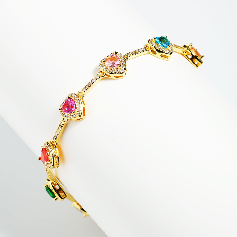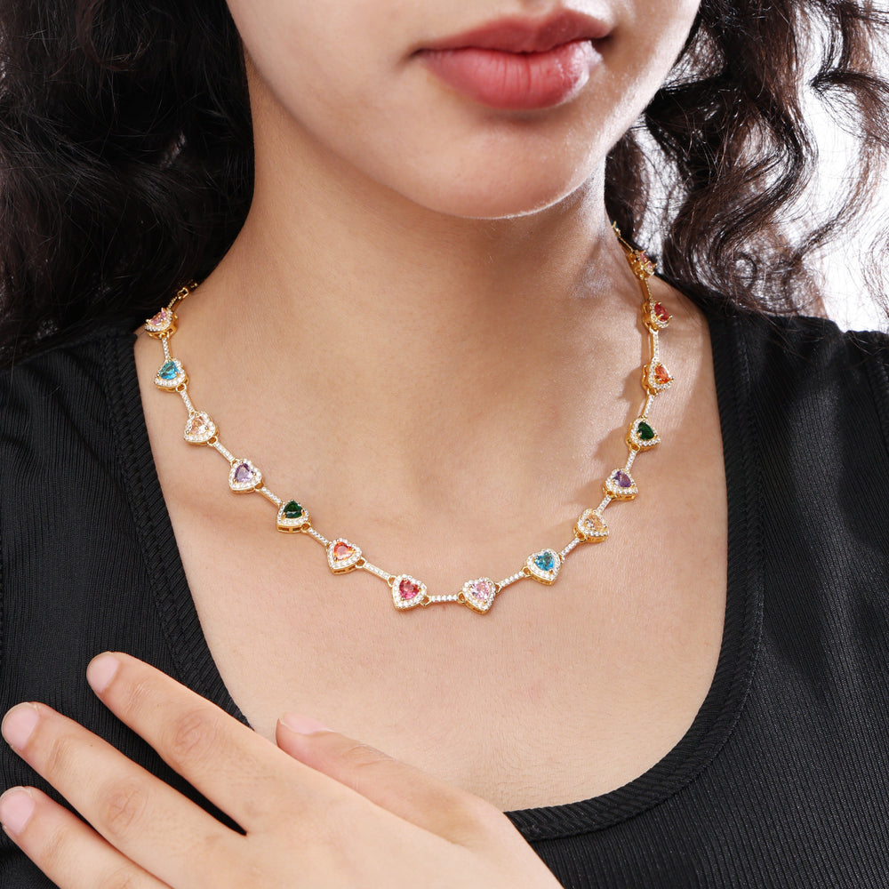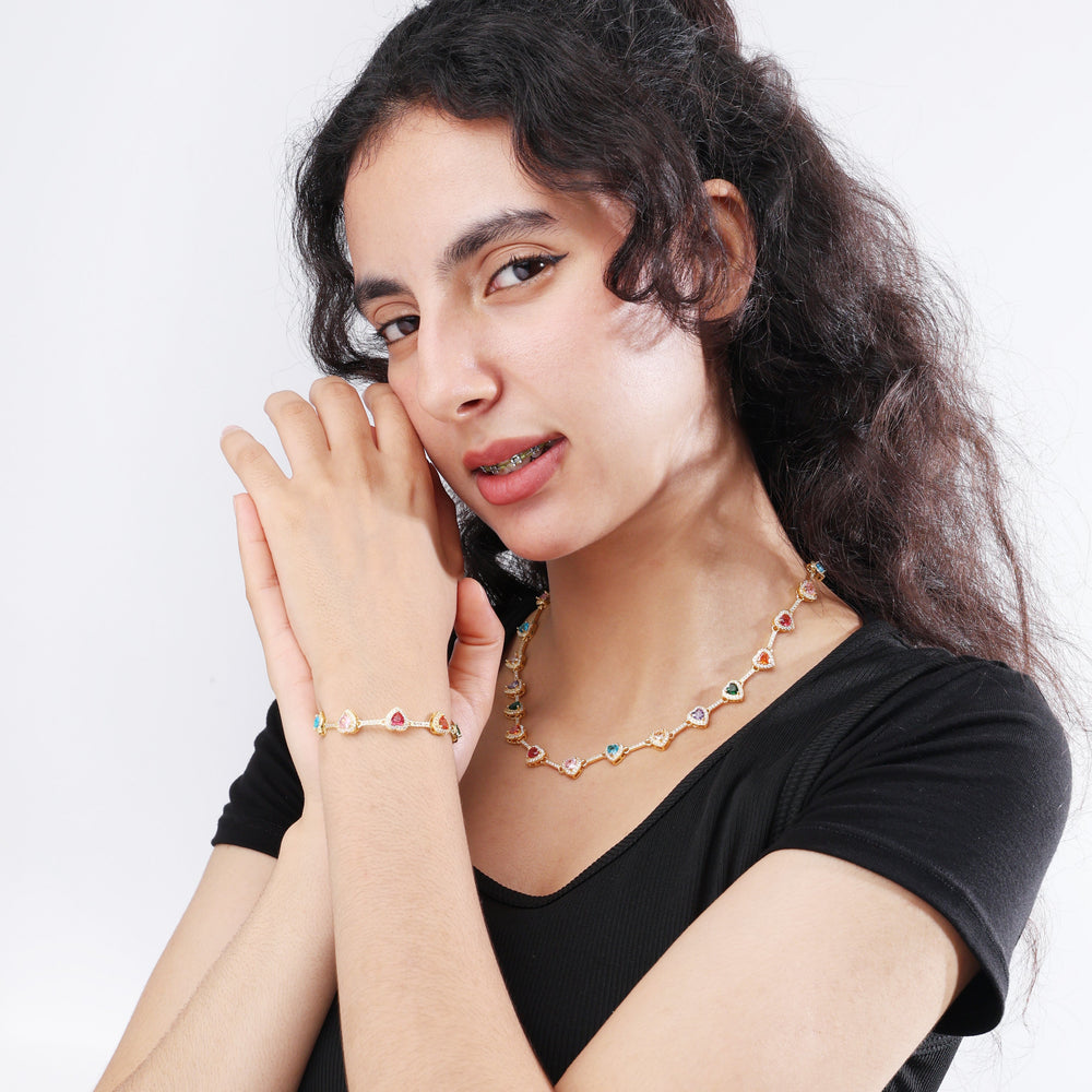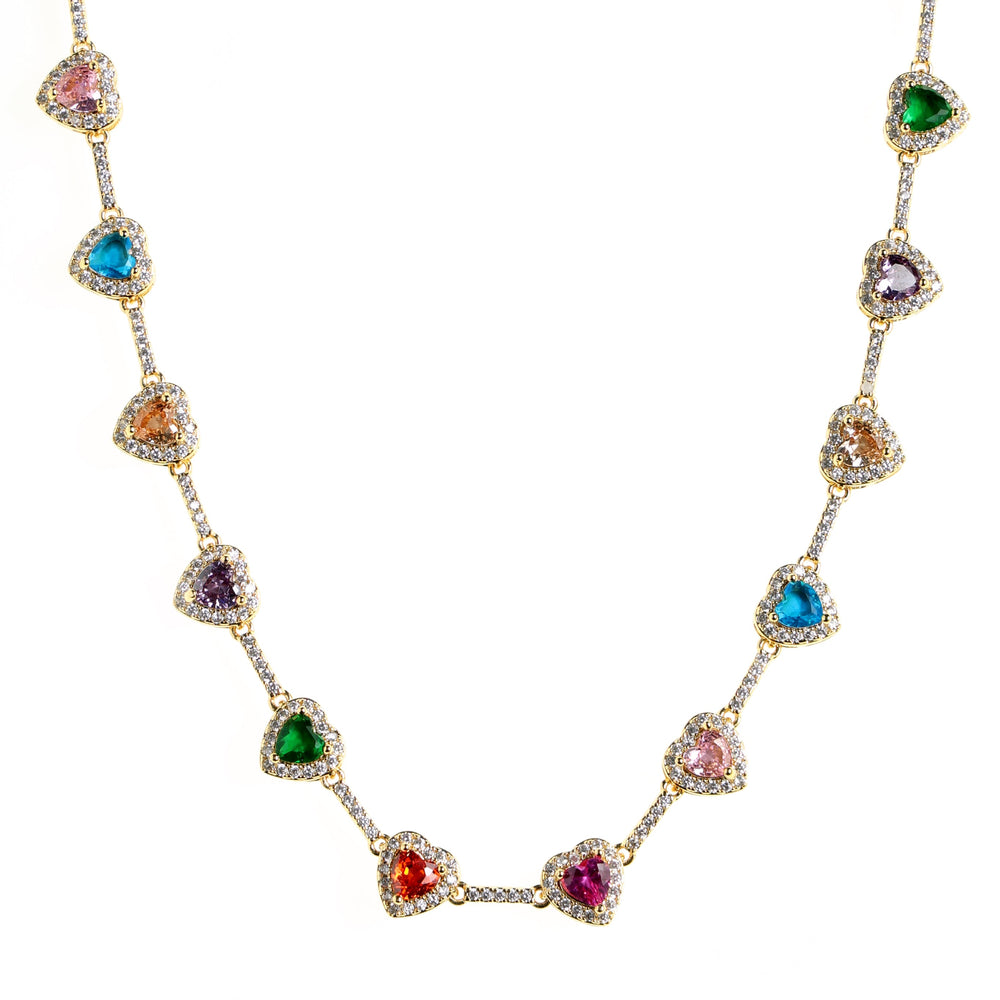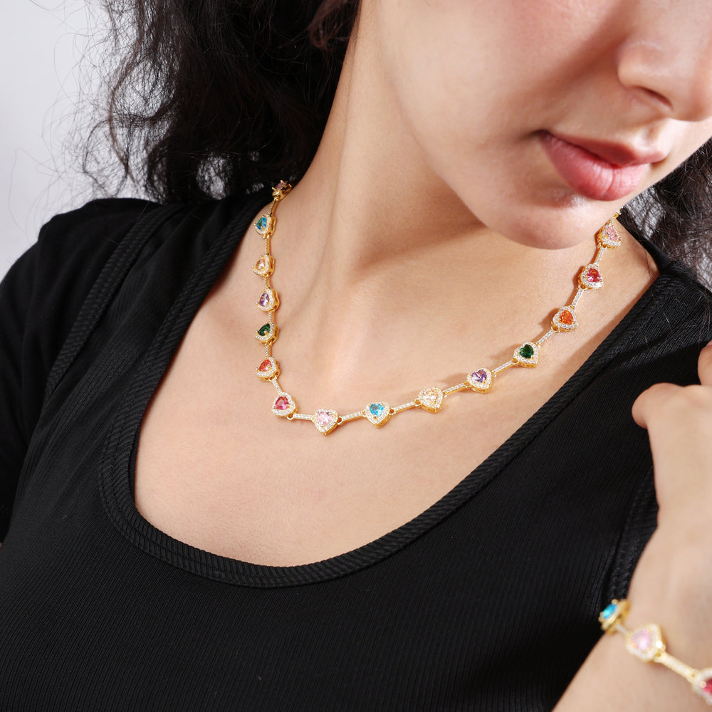 Selected rainbow🌈🌈 department gems, carefully carved into love 💗 shape, like a rainbow brilliant. The outer edge of each love is inlaid with small white diamond fragments 💎, reflecting the bright light in the sun, like love plated on the eternal halo ✨. Between the love with 925 silver plated chain series, smart and elegant, gently swaying with the pace. This is no ordinary necklace, but a rainbow you can wear, a fairy tale hidden between your collarbones." Let rainbows live in your closet and love stay close to your heart."