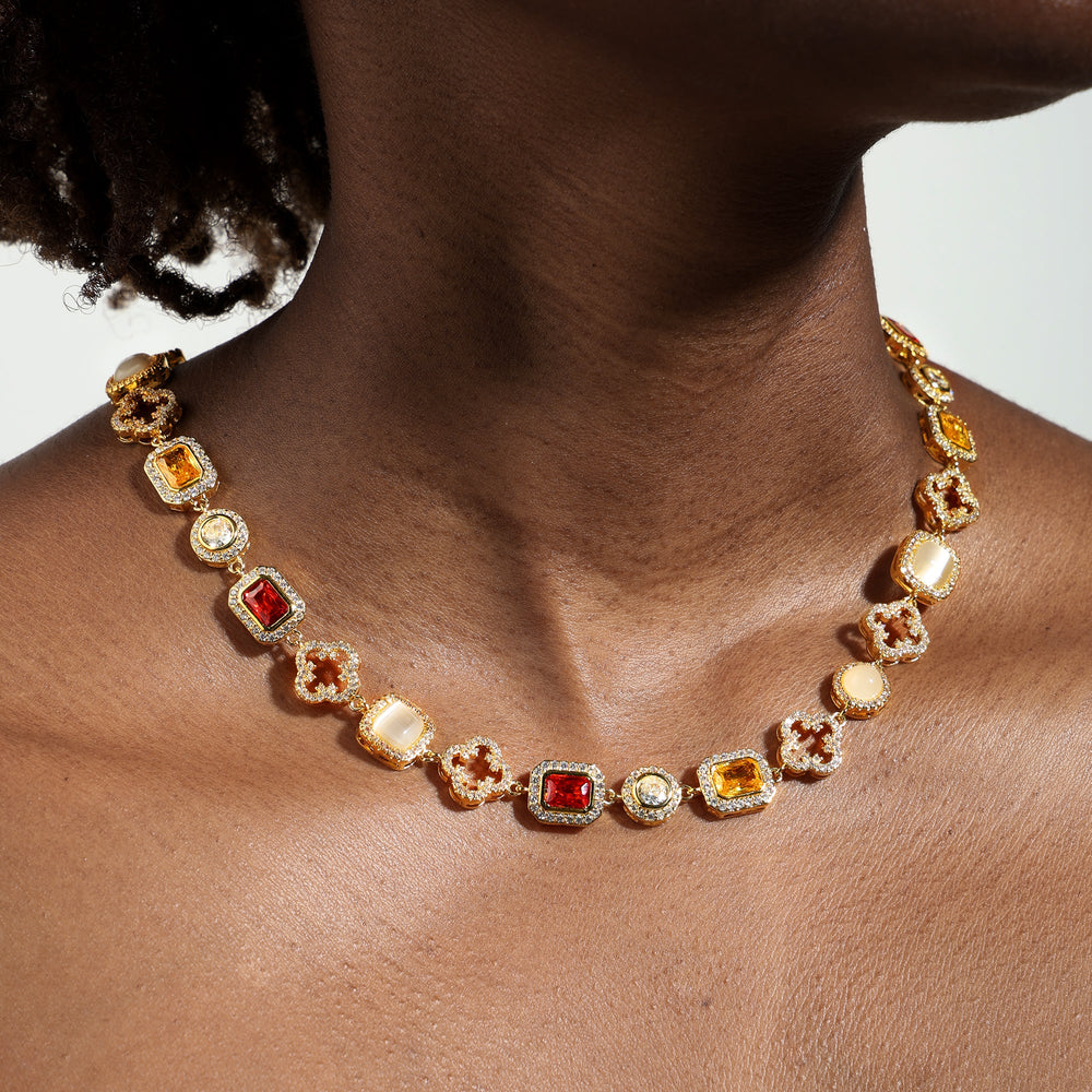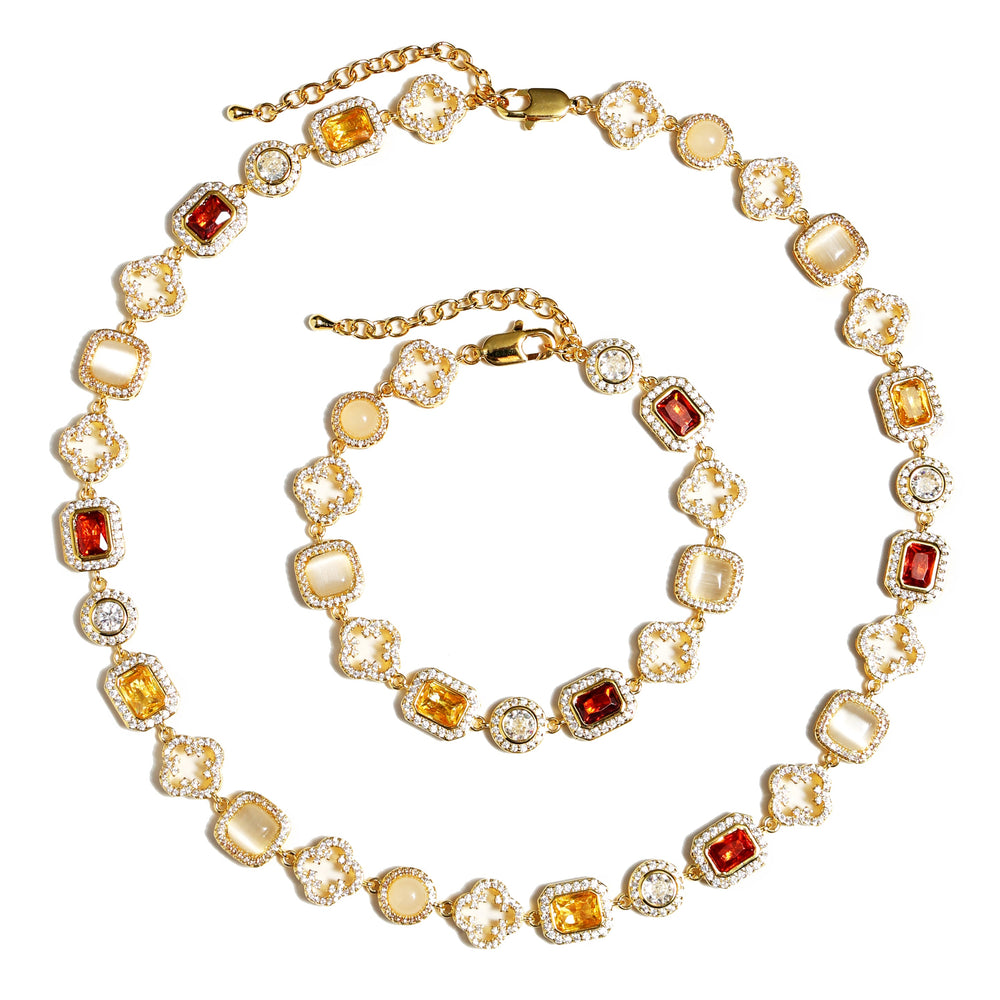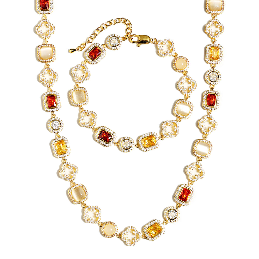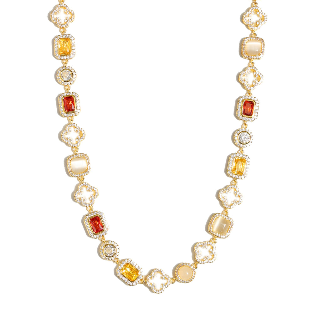 This necklace selects red zircon, yellow zircon and amber crystal, with exquisite ice crystal cutting technology to create circular and square geometric beauty, each gem is as bright as snow and ice, unique design with hollow clover🍀🍀 pattern artfully connected, symbolizing the eternal flow of luck in the crystal world. Whether worn alone or folded, it fits perfectly🔥🔥!