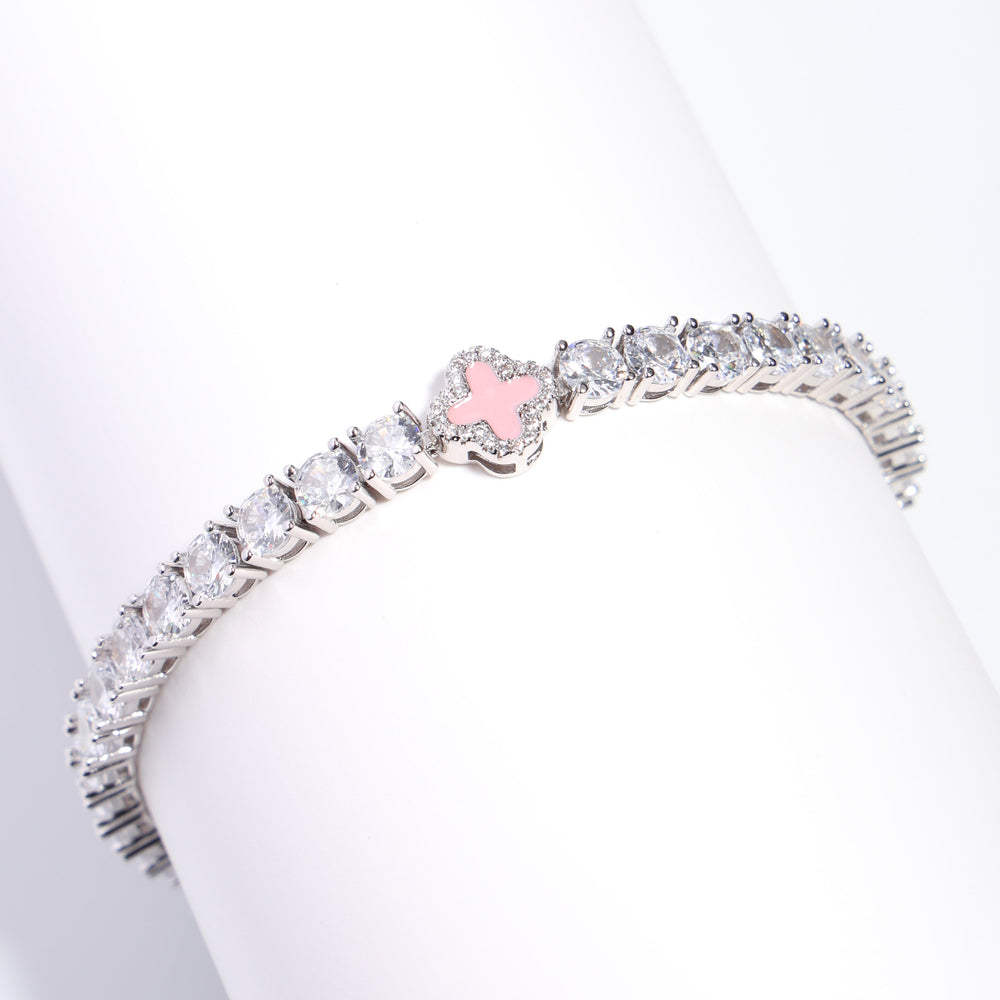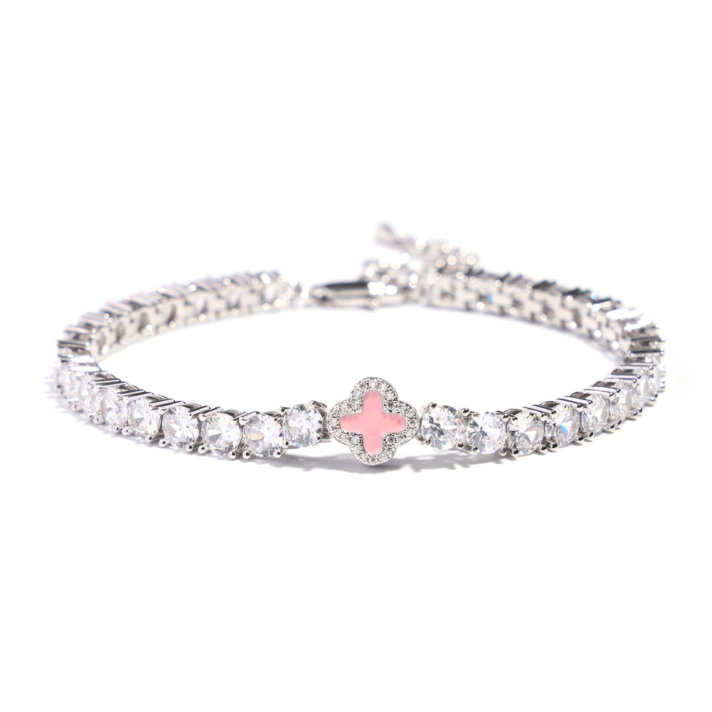 Using the top white cubic zircon oxide, through the ice cutting process, showing a snowflake❄️ crystal texture. The center is inlaid with cherry blossom powder 🌸enamel four-leaf clover, and the exterior is densely inlaid with white crushed zircon to create a dreamy icing effect. Weave the tenderness of cherry blossoms and the purity of ice and snow into your lucky bracelet." Let you have a girlish romantic expectation every day.