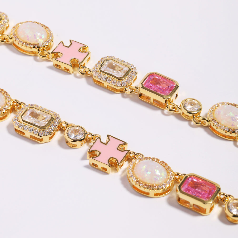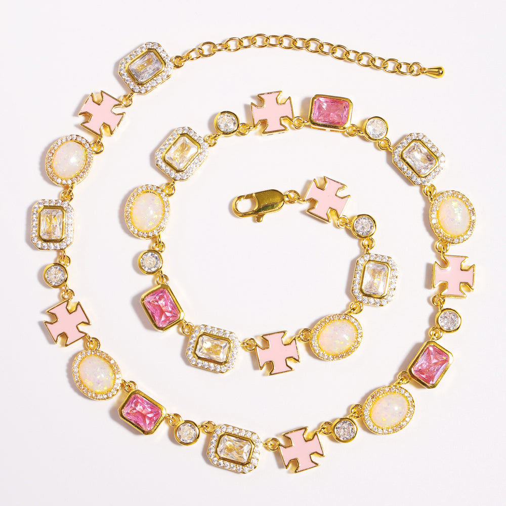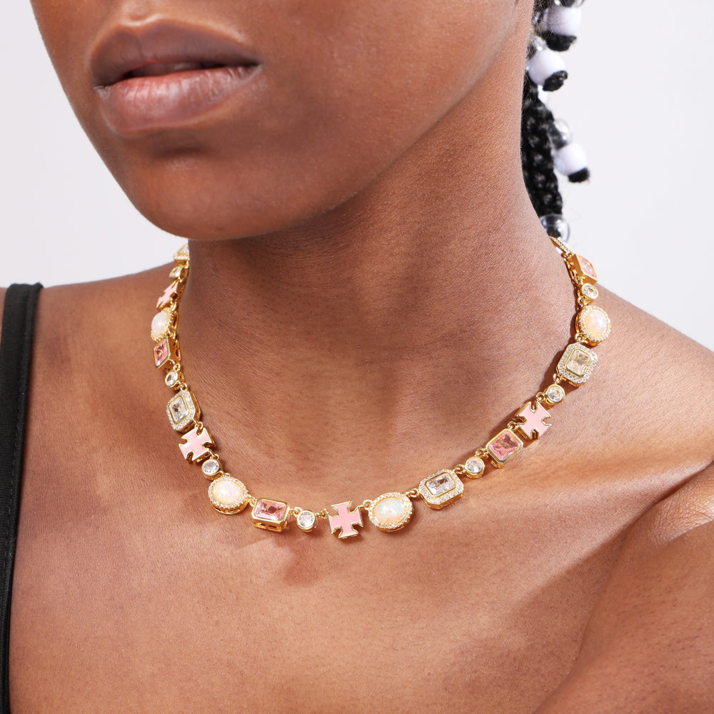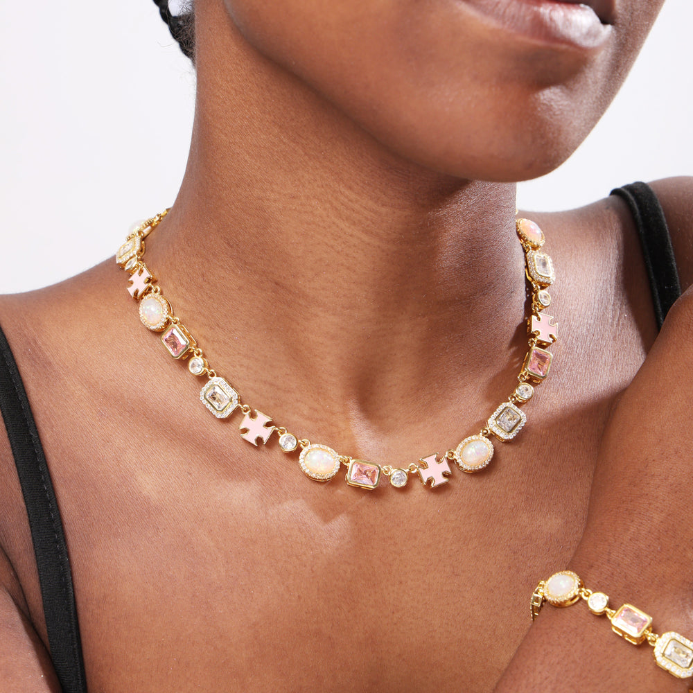 Like a sunset captured in stone, this necklace cascades from delicate rose quartz to vibrant pink tourmaline. Each hand-selected gemstone shimmers with feminine charm, perfect for adding a touch of romance to any look.