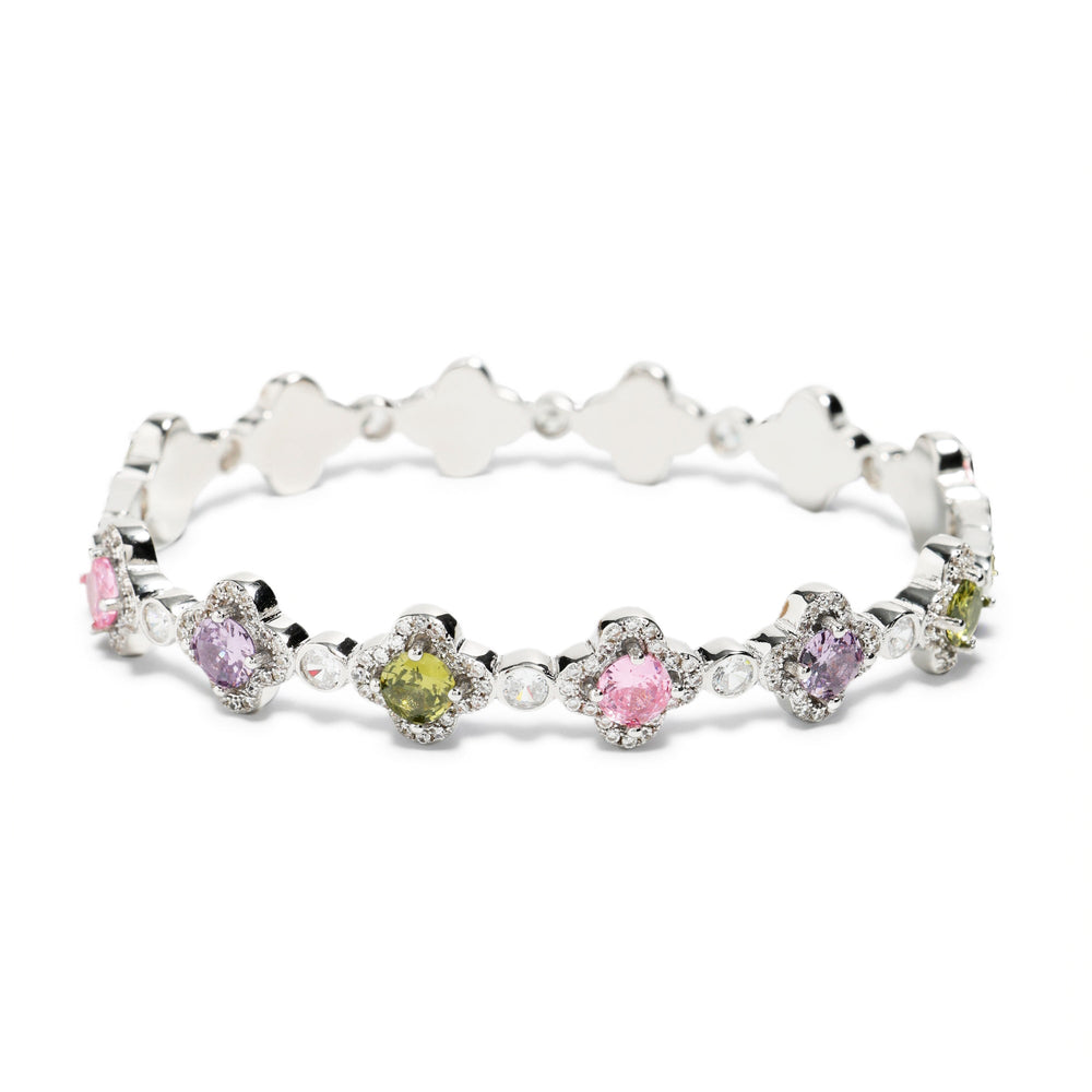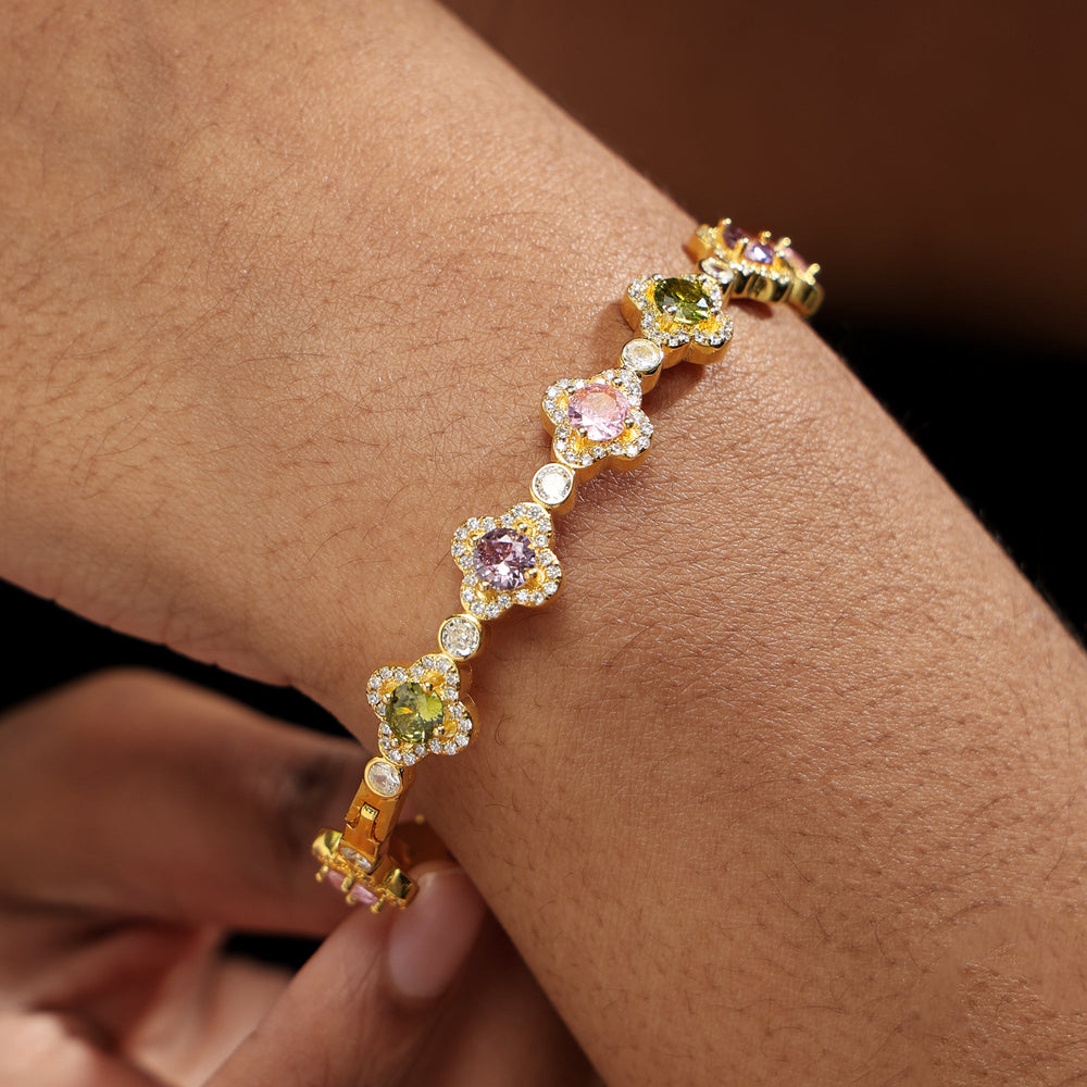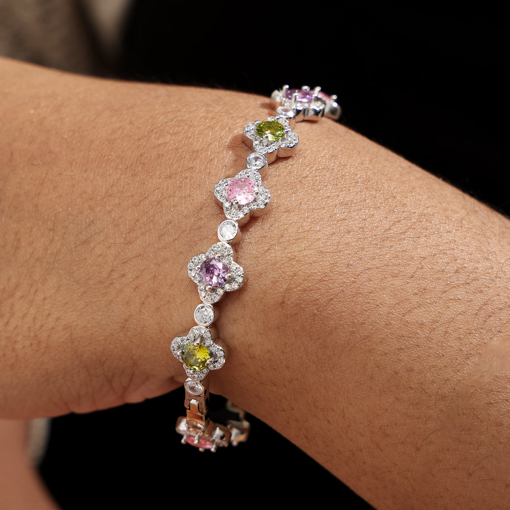 Our bracelet is made of bright candy🍬🍬🍬 colored zircon to create a dream four-leaf clover🍀🍀, each one shining unique pink, yellow, green and other vibrant colors, symbolizing the diversity of luck and beauty. Between the four leaf clover by pure white round small treasure series, such as dew💧💧 as fresh and smart. Whether worn alone or folded with other bracelets, it will make you more beautiful!