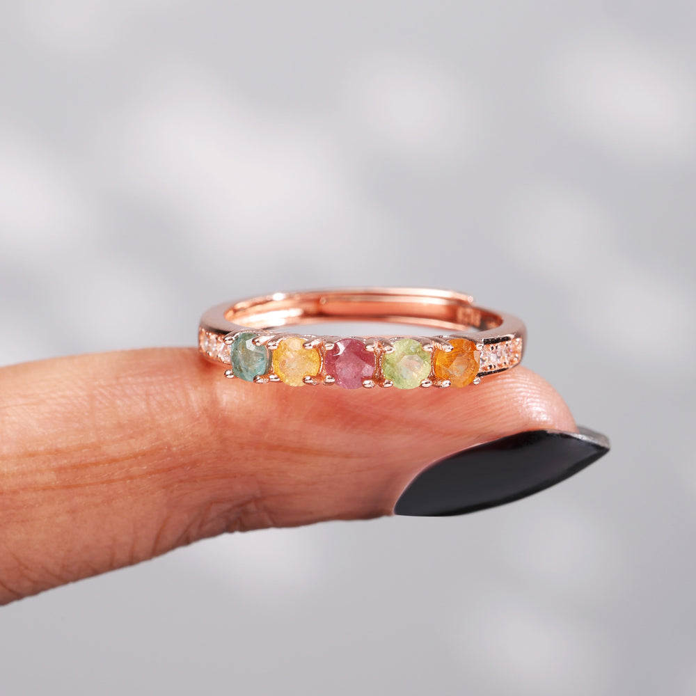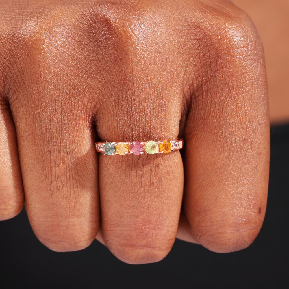 Embrace understated beauty with the Petite Round Cut Tourmaline Minimalist Stacking Ring, where delicate color meets timeless design. This slender band features a single row of miniature round-cut simulated tourmalines, set flush against a polished sterling silver base for a seamless, modern look. The stones—curated in a soft gradient of blush pink, sky blue, and mint green—add a whisper of color that catches light gently, offering just enough sparkle for daily wear without overwhelming your style.