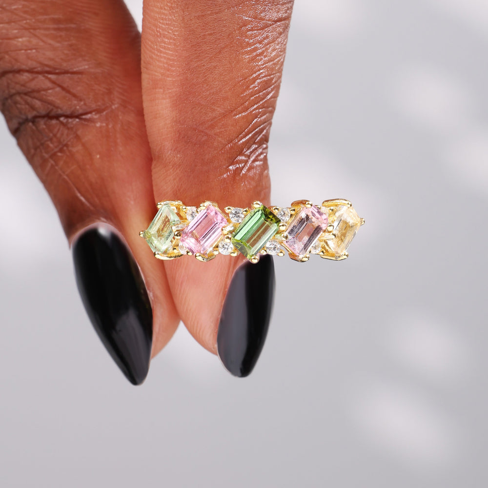 Discover the perfect fusion of architectural precision and radiant color with the Sparkle Baguette Tourmaline Ring. This striking piece features an innovative arrangement of meticulously cut baguette simulated tourmalines, set in a dynamic diagonal formation that captures and reflects light from every angle. Each vibrant stone is carefully hand-set to create a mesmerizing play of color and brilliance, evoking the sleek elegance of modern art and the timeless allure of jewelry craftsmanship.
