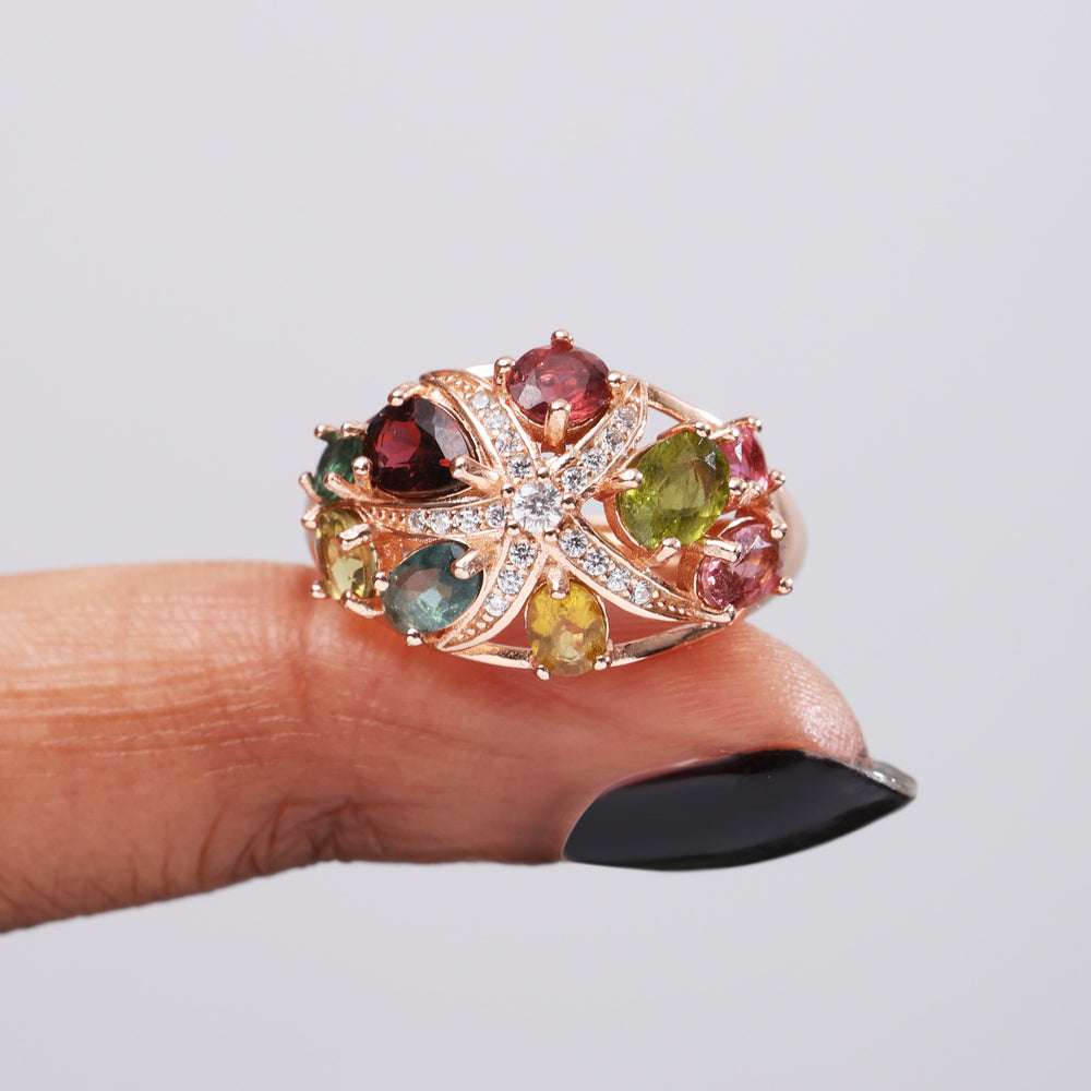 Step into a world where timeless elegance meets a kaleidoscope of color. "The Vintage Oval Mirage" is not merely a ring; it's a wearable heirloom, a piece of art history reborn on your hand. This exquisite statement piece captures the romance of a bygone era with its grand, candy-like oval cabochon cut tourmaline, showcasing a mesmerizing blend of [e.g., raspberry pink, ocean blue, and sun-kissed yellow] that seems to shift and dance with every movement.